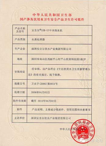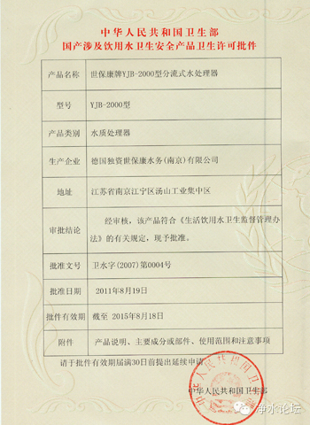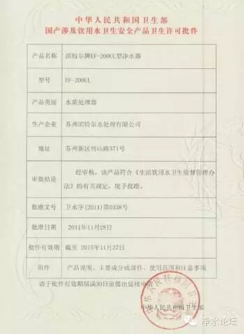 “水批”全称应该是涉水产品卫生批文,简单来说就是净水机能销售给消费者的“身份证”,是由中华人民共和国卫生部颁发的,表示从机器质量到出水品质全方位都已经检验过是合格可以上市的,所以亲要认准水批。
